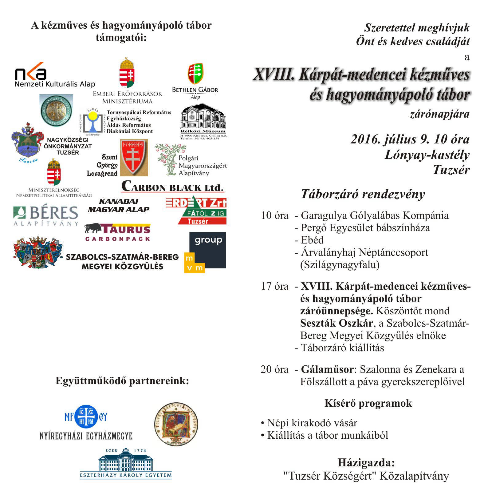 Július 8-án egy egész napos rendezvényt generálunk a táborzáró napon. Kiállítást rendezünk a gyerekek alkotásaiból, illetve népi játékokat mutatnak be a gyerekeink a vendégeknek. Meghívott népi iparművészek, népművészek alkotásaiból kirakodóvásár is színesíti a napot. Lesz népi ételek főzése, tájegységenként, színházi előadás, gólyalábasok, stb…Este táncházzal zárjuk a tábort.