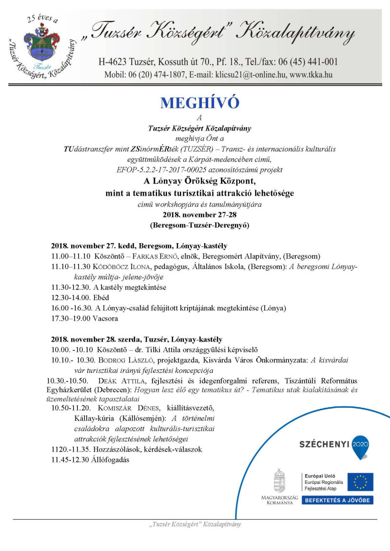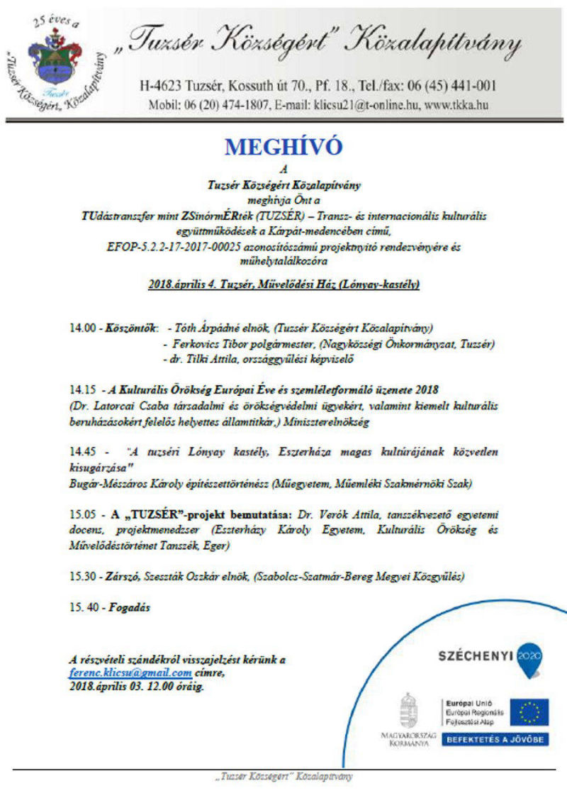 A projekt minden egyes szakmai megvalósítója egyetlen közös célért dolgozik: a Tuzsér községben felállítandó Lónyay Örökség Központ megteremtésén, a kulturális turizmus fellendítésén, egy hátrányos térség gazdasági és kulturális adottságainak jobb kihasználásán, amely az egymással szervesen összekapcsolódó, más-más országban található földrajzi területek és az ott élő nemzetiségek kapcsolatának szorosabbra fűzését feltételezi. Mindennek alapja és zsinórmértéke pedig kizárólag a szakmai és jó gyakorlatokból szerzett tudás kölcsönös megosztása (tudástranszfer) lehet. A szakmai tevékenységek metszéspontjában a halmozottan hátrányos régióban elhelyezkedő Tuzsér község és vonzáskörzete, illetve ezeknek a kistérségi településeknek a teljes lakossága áll. Pályázatunk címében is erre a kérdéskörre fókuszálunk. - Letöltés